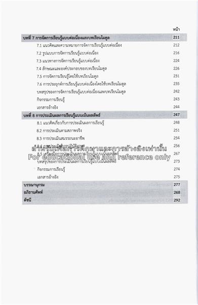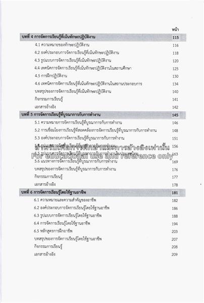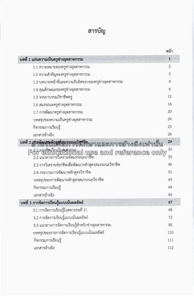 สารบัญ : | – บทที่ 1 แก่นความเป็นครูช่างอุตสาหกรรม – บทที่ 2 การพัฒนาหลักสูตรสมรรถนะวิชาชีพ – บทที่ 3 การจัดการเรียนรู้แบบเน้นผลลัพธ์ – บทที่ 4 การจัดการเรียนรู้ที่เน้นทักษะปฏิบัติงาน – บทที่ 5 การจัดการเรียนรู้ที่บูรณาการกับการทำงาน – บทที่ 6 การจัดการเรียนรู้โดยใช้ฐานอาชีพ – บทที่ 7 การจัดการเรียนรู้แบบต่อเนื่องและบทเรียนโมดูล – บทที่ 8 การประเมินผลการเรียนรู้แบบเน้นผลลัพธ์. |
